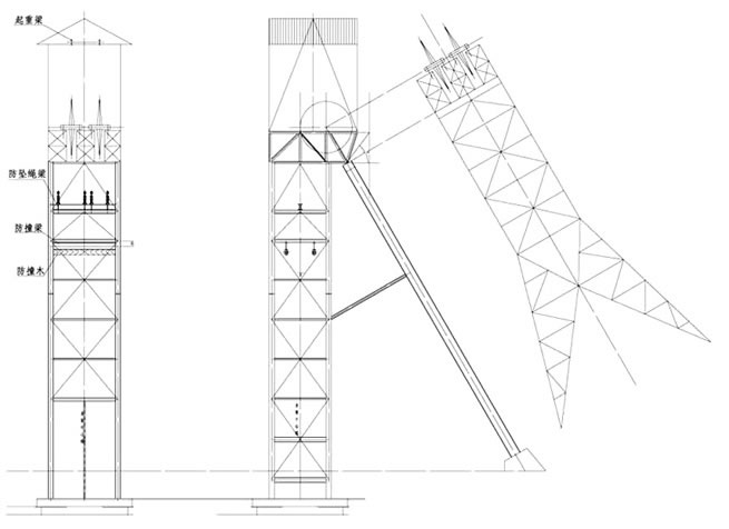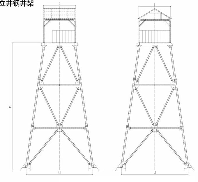 說明: 1、本型鋼井架大梁、斜撐采用厚壁鋼管。 2、各鋼管連接部分采用法蘭連接,螺栓均采用高強(qiáng)度螺栓,頂棚采用焊接方式。 3、井架全部采用重防腐工藝,除銹后噴鋅,再噴重防腐面漆兩遍。 立井鋼井架特征說明 以上所列立井鑿井井架均為鋼管井架,包括五個型號共七種。本井架系列可滿足井徑3.5~8.0cm,井深200~1000m的立井井筒施工及其工藝要求,其中V型井架更適用于采用大型機(jī)械化配套設(shè)備的深井施工。